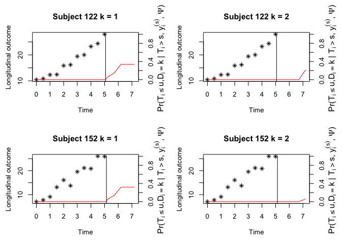 survfit <- survfitJMMLSM(fit, seed = 100, ynewdata = ynewdata, cnewdata = cnewdata,