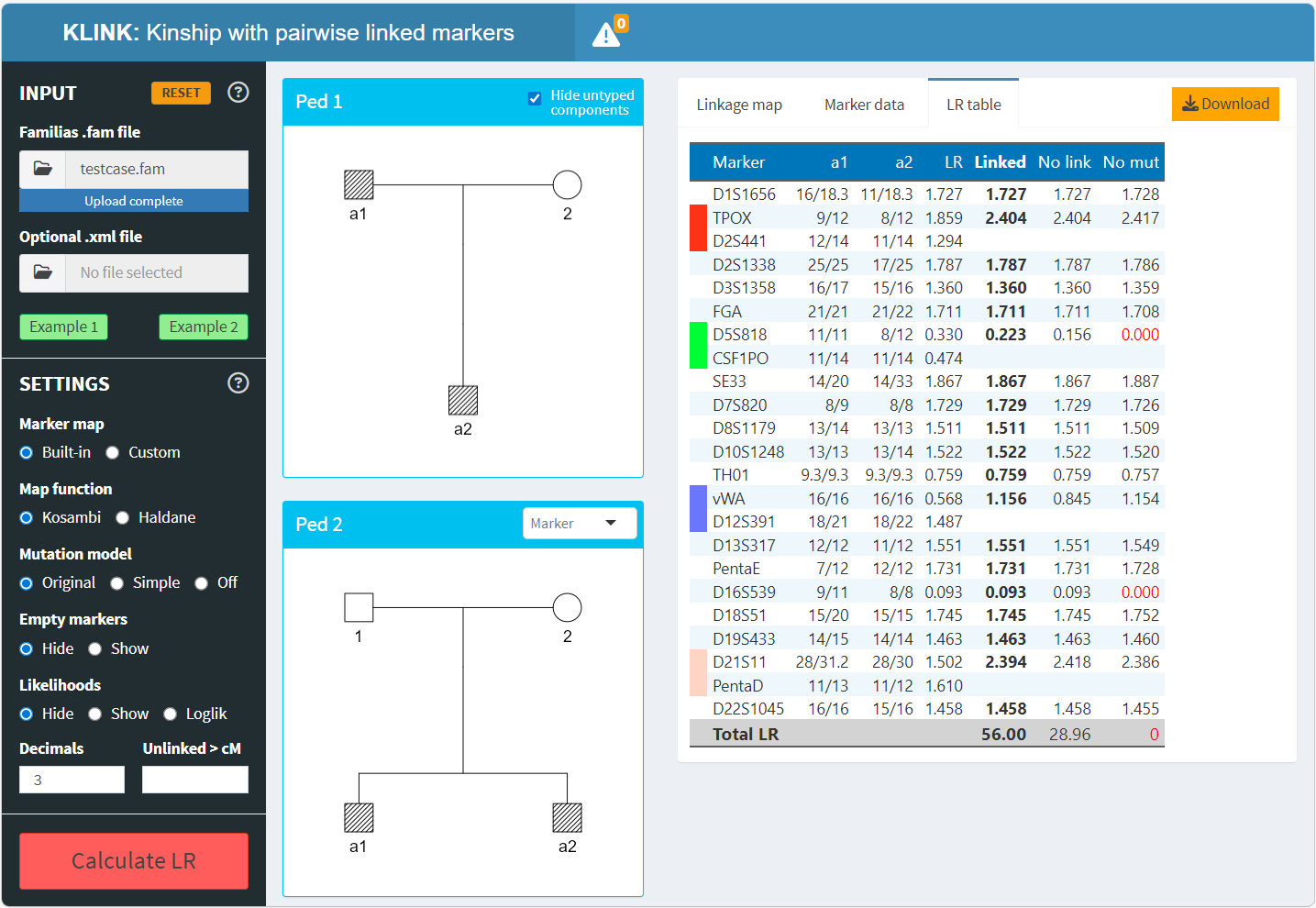 KLINK is an R package and a Shiny application for LR calculations in forensic kinship testing. For more information, see the KLINK website.