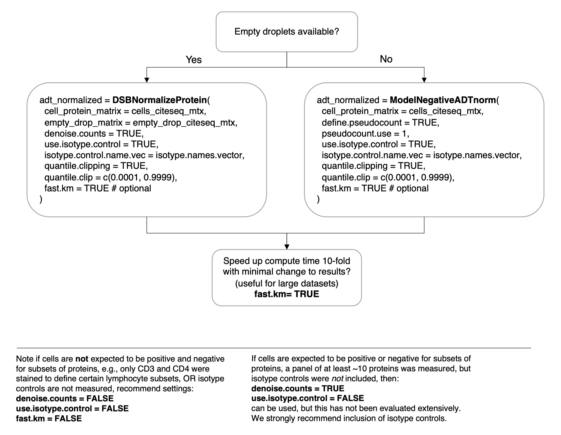 Our paper combined experiments and computational approaches to find ADT protein data from CITE-seq and related assays are affected by substantial background noise. We observed that ADT reads from empty droplets—often more than tenfold the number of cell-containing droplets—closely match levels in unstained spike-in cells, and can also serve as a readout of protein-specific ambient noise. We also remove cell-to-cell technical variation by estimating a conservative adjustment factor derived from isotype control levels and per cell background derived from a per cell mixture model. The 2.0 release of dsb includes faster compute times and functions for normalization on datasets without empty drops.
