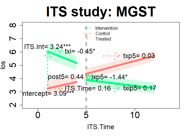 plot(im22, "ITS", add.legend="top", xlim=c(-.75, 13.1), ylim=c(2, 8), main="ITS study: MGMT", col=c("dodgerblue","goldenrod"), lwd=7, cex=2, cex.axis=2, cex.lab=1.5,  cex.main=3, cex.legend=1.25, arrow=TRUE, xshift=c(0, .5), cex.text=1.25, name=F, coefs=TRUE, round.c=2, pos.text= list("txp5"=3, "post9"=4), tcol="springgreen", cfact=T, conf.int=TRUE, adj.alpha=0.3, add.means=TRUE)