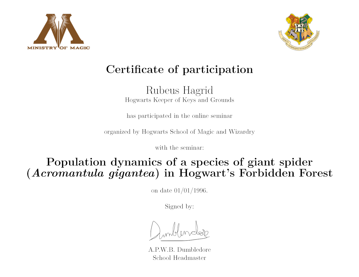 Here, Albus Dumbledore certifies that four of the school teachers have participated in some seminars with different titles, different affiliations, dates and communication types.