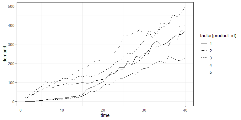 We show below, the plots of demand for the products with product_id=1,2,…,5: