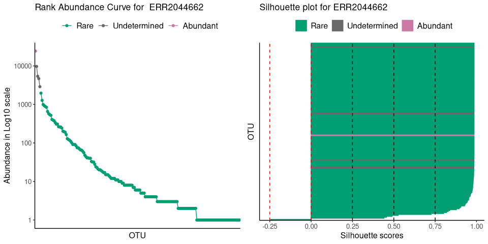 More specifically, the partitioning around medoids (k-medoids) algorithm is used to divide taxa within a sample into clusters. The clusters are then ordered based on a user-defined classification vector. By default, our method classifies all taxa in: “rare”, “undetermined” or “abundant”. In alternative, the user can change the number of classifications. To do so, ulrb includes functions to help the user decide the number of clusters (k), but it is also possible for ulrb to automatically decide the number of clusters (equivalent to the number of classifications). Besides clustering, ulrb includes functions to help evaluate the clustering quality (e.g. average Silhouette score).